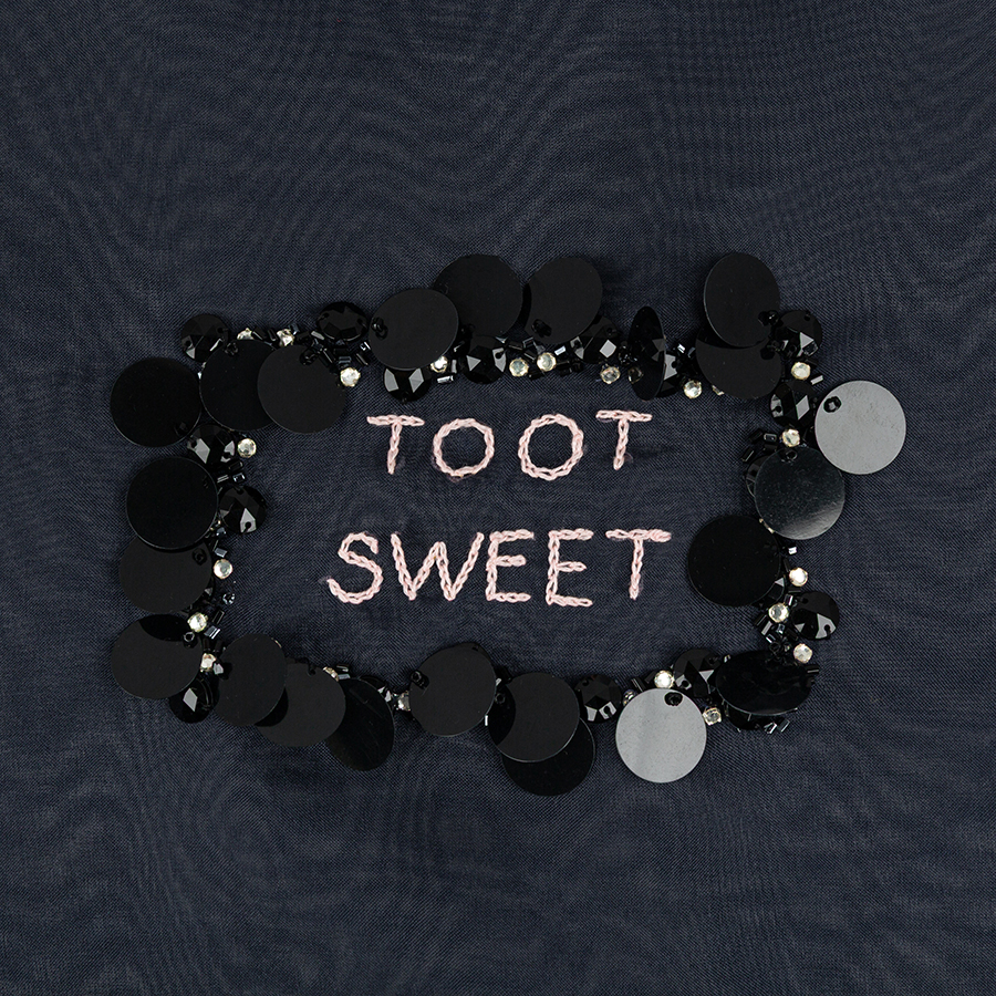 Toot Sweet Navy Blue Silk Organza Shopper Bag with a handful of excitable Hand Embroidered Gummy Bears. Using vintage sequins, stones and glass beads.