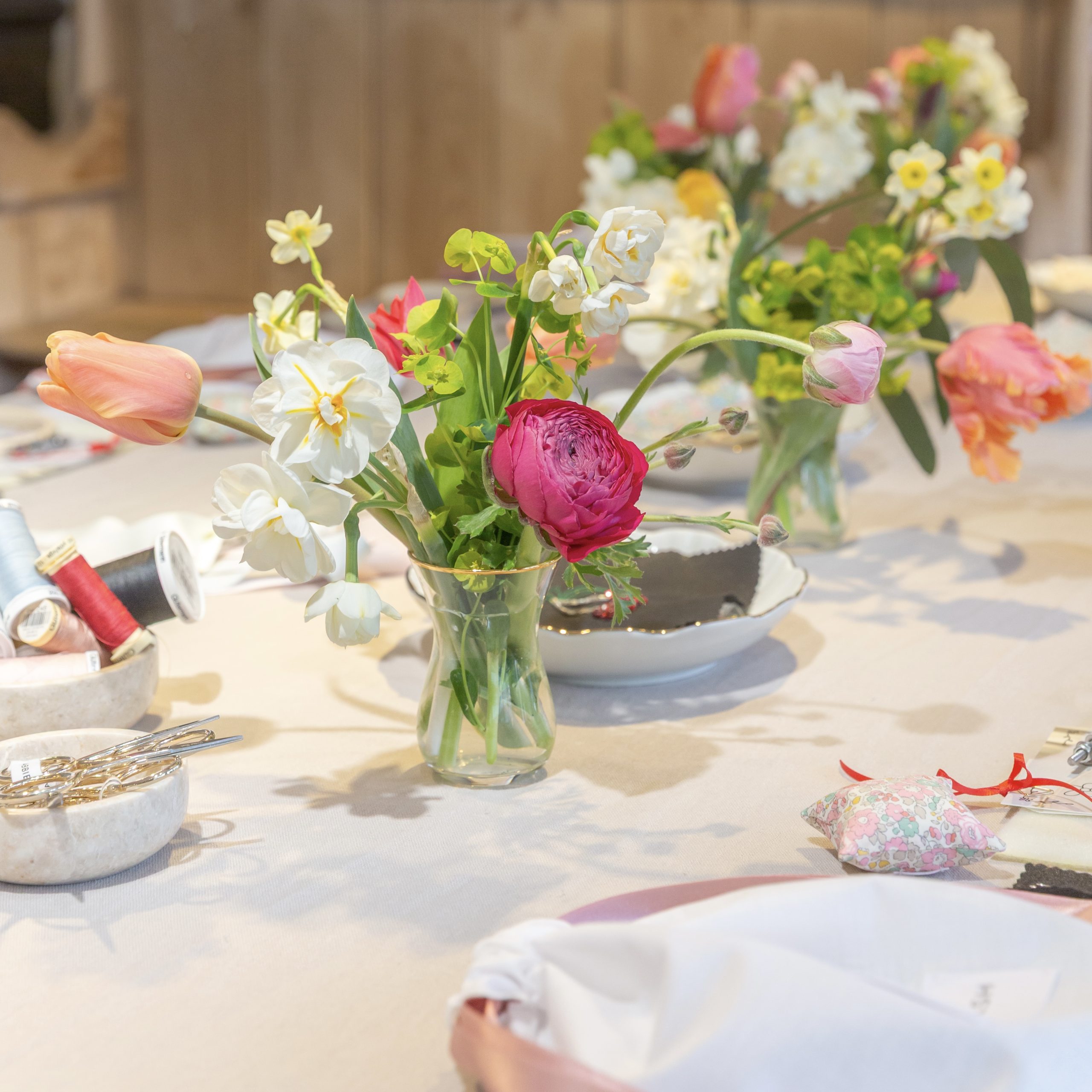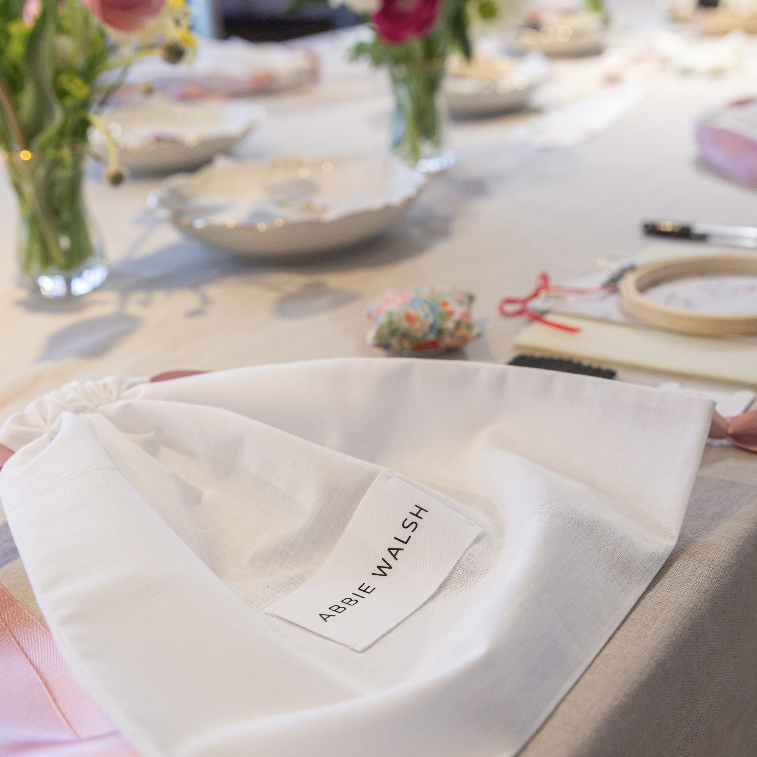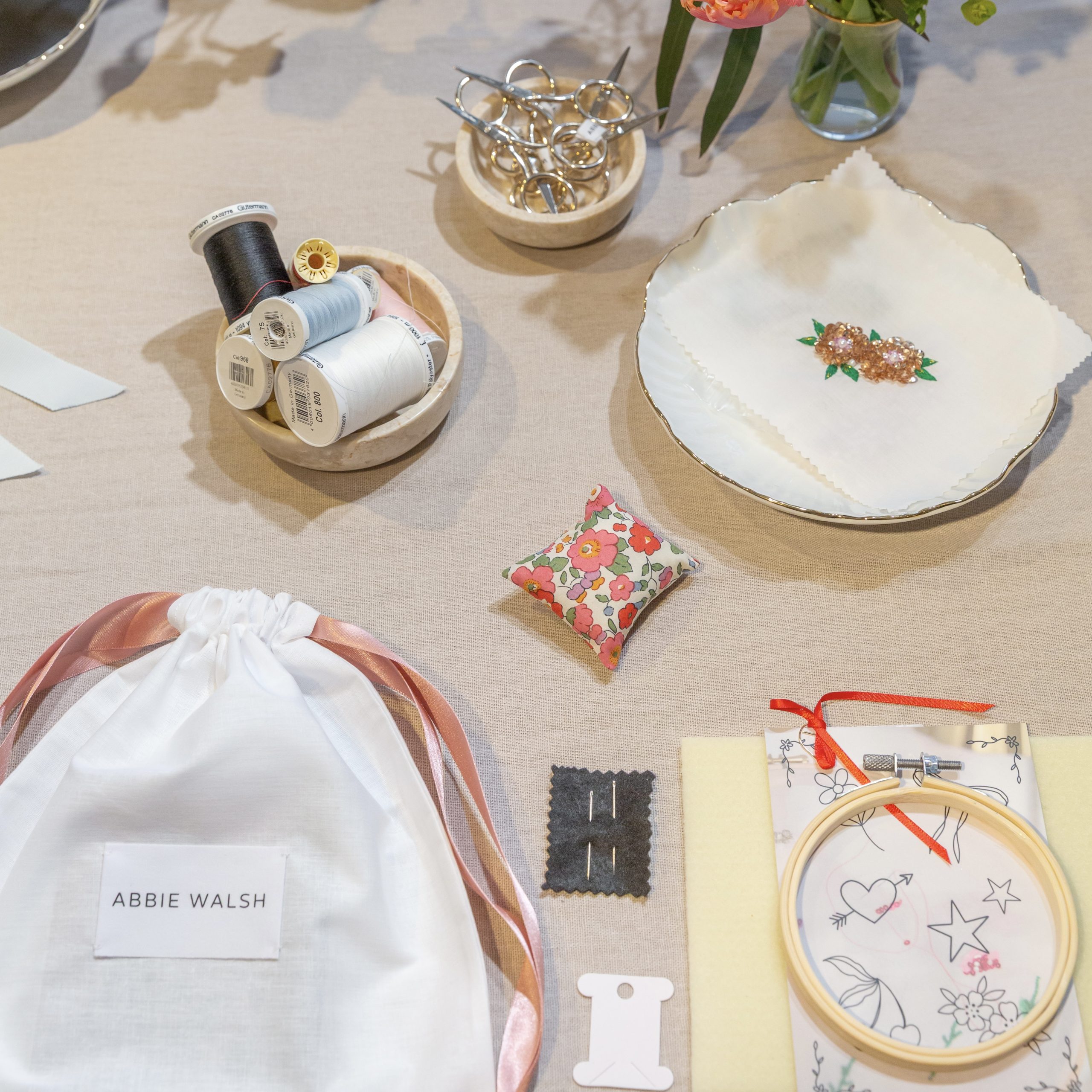 The workshop includes light refreshments, glass of Fizz, a pair of Abbie Walsh Tie-Side Knickers, your very own embroidery kit includes; hand crafted bag with satin ribbon, embroidery hoop, needles and holder, thread card, envelope to bring home beads/sequins, pen, hand crafted pin cushion, design card (which you can use to make notes on) and beading mat.